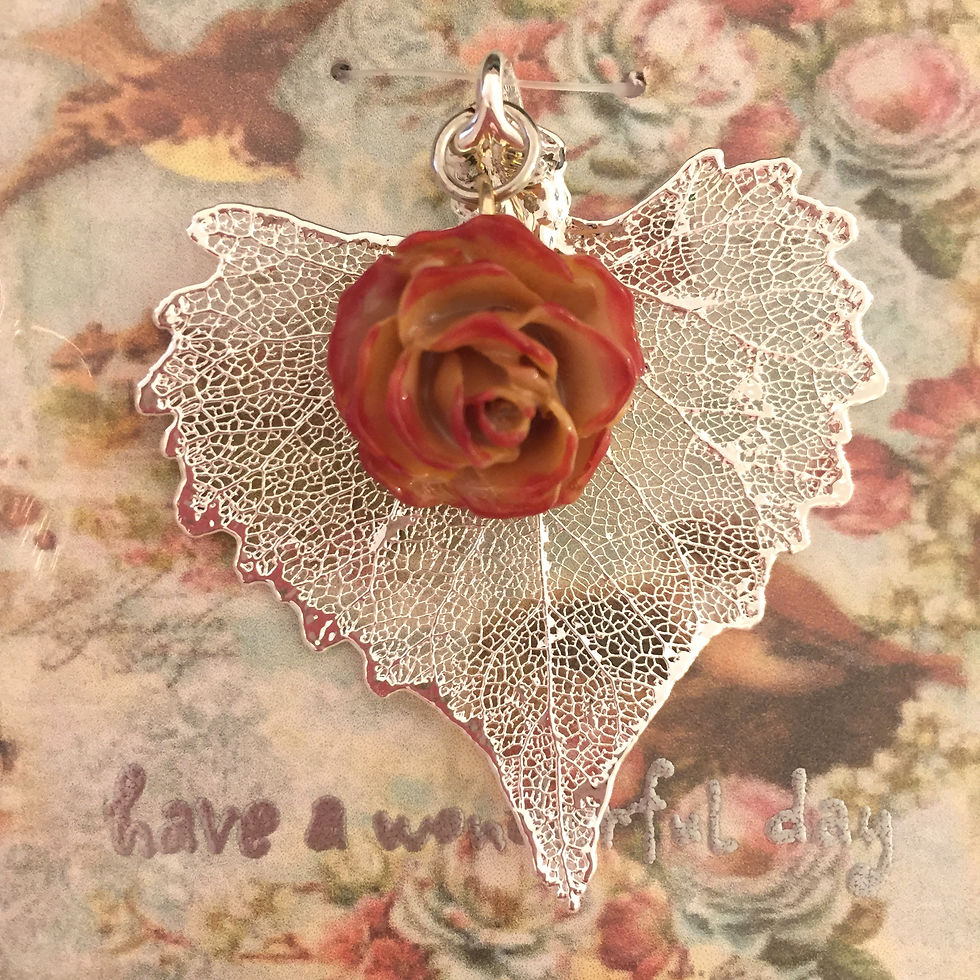 A Real Cottonwood Leaf & a Antique Bloom Rose in Silver Pendant
